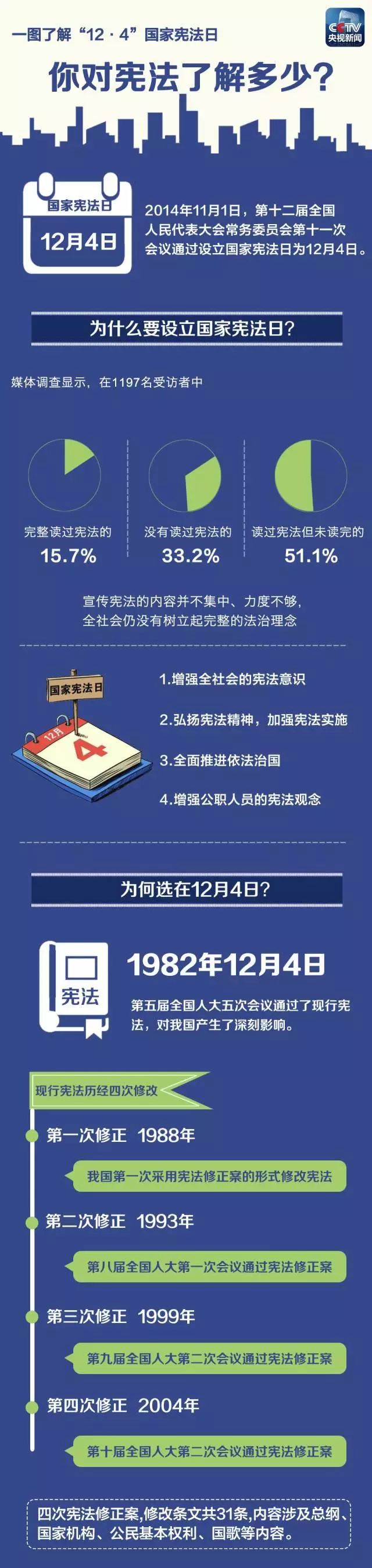 1982年12月4日,中国现行宪法正式颁布实施,国家确定这一天为“全国法制宣传日”。2014年11月1日,第十二届全国人民代表大会常务委员会第十一次会议通过设立12月4日为国家宪法日。2014年12月4日是中国首个国家宪法日。